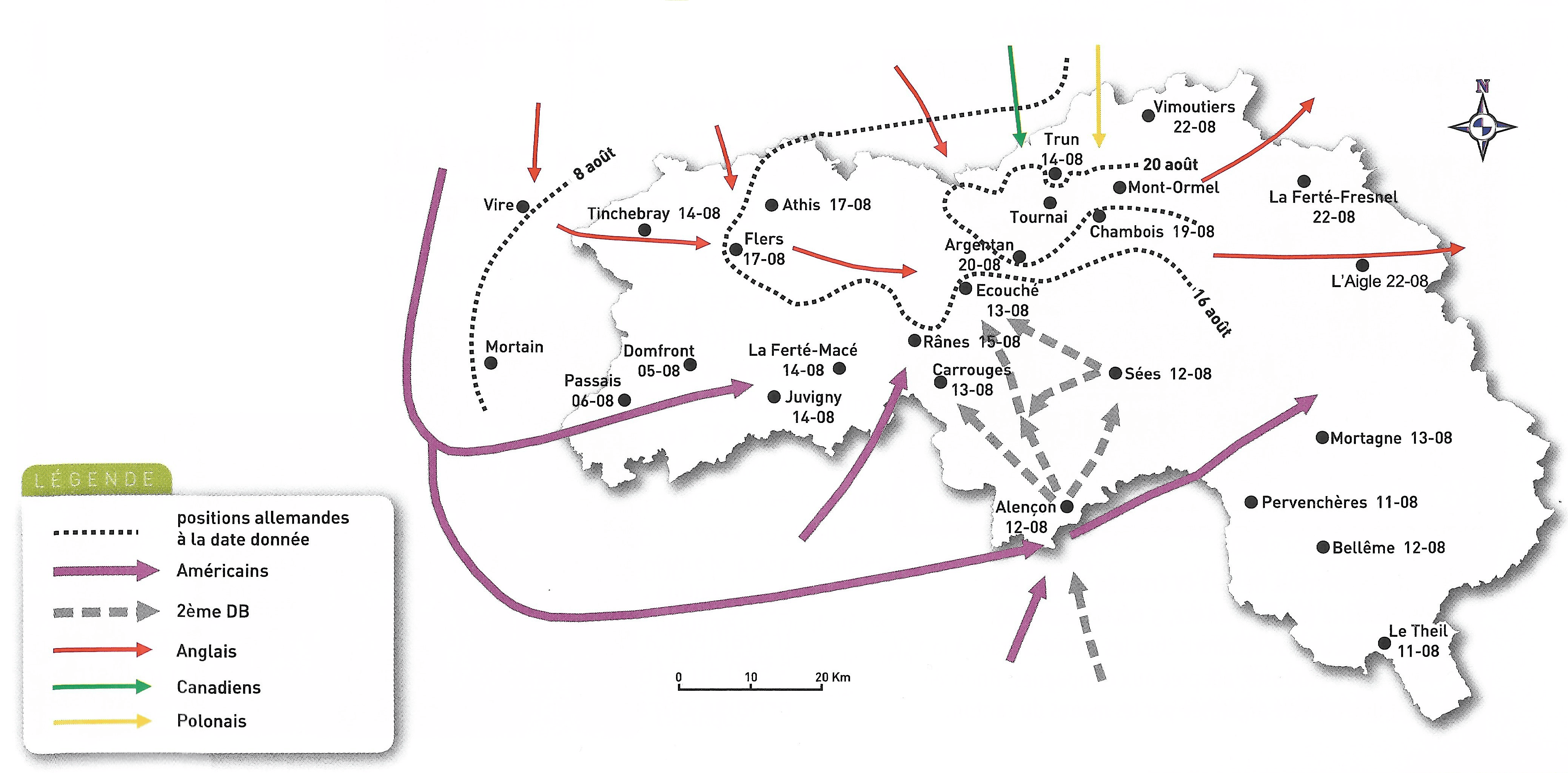 Leclerc poursuit vers le Nord ; ses troupes s’emparent d’Ecouché le 13 août. Pendant ce temps, les Américains continuent leur progression au Sud-Ouest et les Anglais au Nord-Ouest. Les Polonais et les Canadiens ferment l’étau au Nord. Les troupes allemandes sont retrouvent donc peu à peu coincées dans un étroit couloir entre Ecouché et le Sud de Falaise (voir carte « La poche de Chambois »).