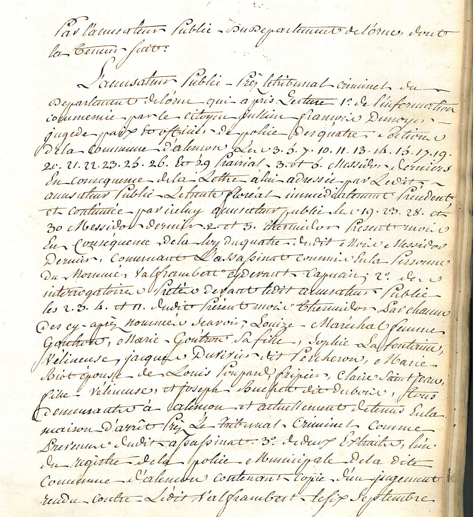 Qu’enfin, aprez lui avoir ôté la vie, on lui trancha la tête, et ses assassins, triomphants de leur propre cruauté, promenèrent cette tête pointée au bout d'un manche à ballet (sic), et éclairée par des flambeaux dans une partie des rues de cette commune, avec le projet de recommencer pareille scène le lendemain, mais nouvelle scène qui, heureusement, n'eut pas lieu par la sage précaution de l'avertissement qui en fut donné à propos à ceux qui se trouvoient couchés sur la liste de proscription qu'on avoit eu l'indiscrétion de publier hautement [...]
