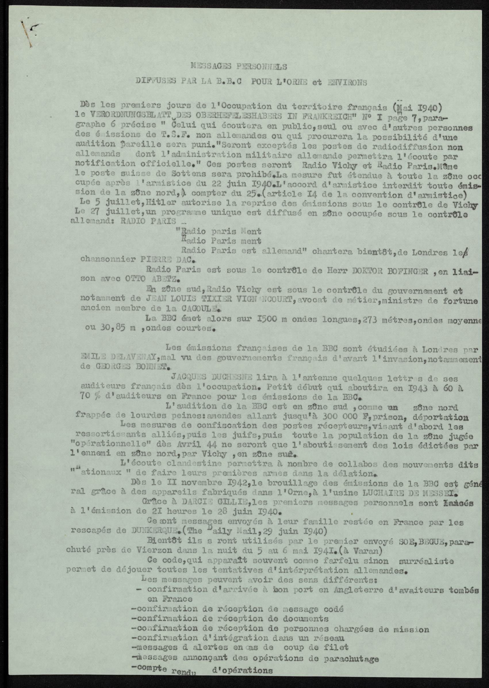 Le document présenté est issu du remarquable fonds documentaire rassemblé par Jean Vigile, correspondant ornais de l’histoire de la Seconde Guerre mondiale. Il a recensé une grande partie des messages diffusés par la BBC (« Radio Londres ») à destination des groupes de résistants de l’Orne et des environs. Cette liste est précédée d’un très utile rappel sur les « messages personnels » et la radio pendant la guerre.
