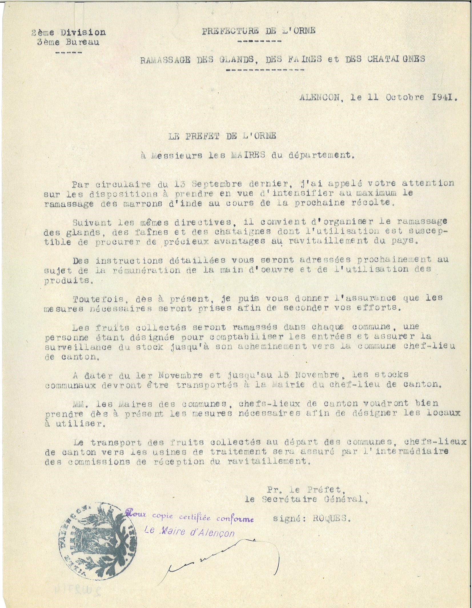 Les conditions de vie pendant les années noires de l’Occupation sont extrêmement difficiles : les produits alimentaires manquent cruellement, à tel point que l’on ramasse les glands, les châtaignes, les faines de hêtre et les marrons d’Inde, « dont l’utilisation est susceptible de procurer de précieux avantages au ravitaillement du pays » comme en atteste ce courrier du préfet adressé aux maires du département le 11 octobre 1941.