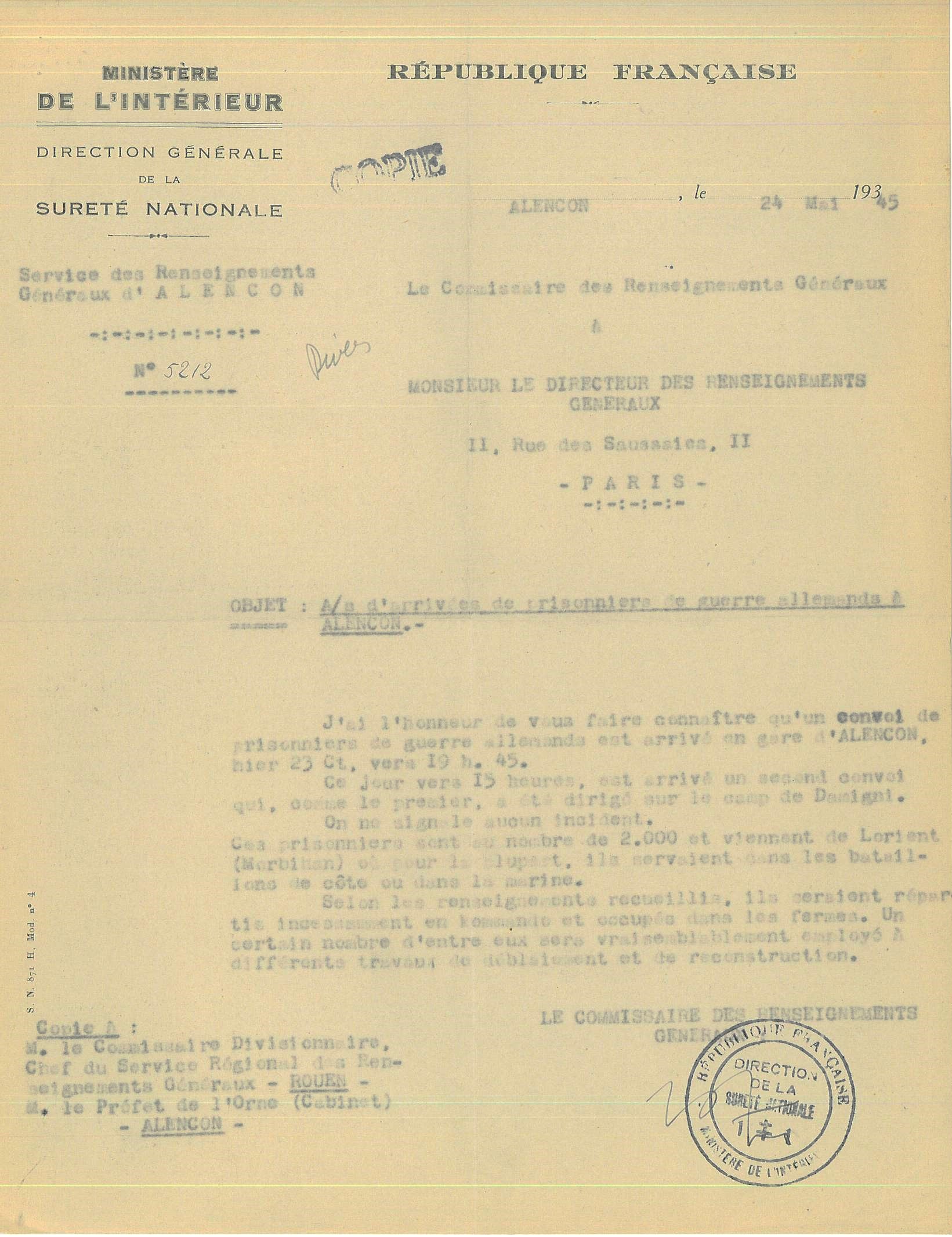 Le chef des renseignements généraux de l’Orne informe sa hiérarchie de l’arrivée en gare d’Alençon d’un convoi de 2000 prisonniers de guerre venus de Lorient, capturés vraisemblablement une quinzaine de jours auparavant lors de la reddition de la poche de Lorient (le 10 mai). Ils vont être mis au travail dans les fermes ou pour les travaux de déblaiement.