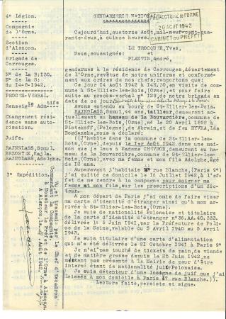 Les gendarmes ont été informés de l’arrivée dans le village d’une famille juive, les Rajnglass, qui n’a pas déclaré sa présence aux autorités. Le document présente donc l’audition de Szmul, le père de famille, né en 1898 en Pologne à « Piotekoff » (sans doute Piotrków Trybunalski) et de son épouse, Kajla (Brzostek) née à Varsovie en 1910. Le couple est accompagné de leur petit garçon, Adolphe, né à Paris en 1930.