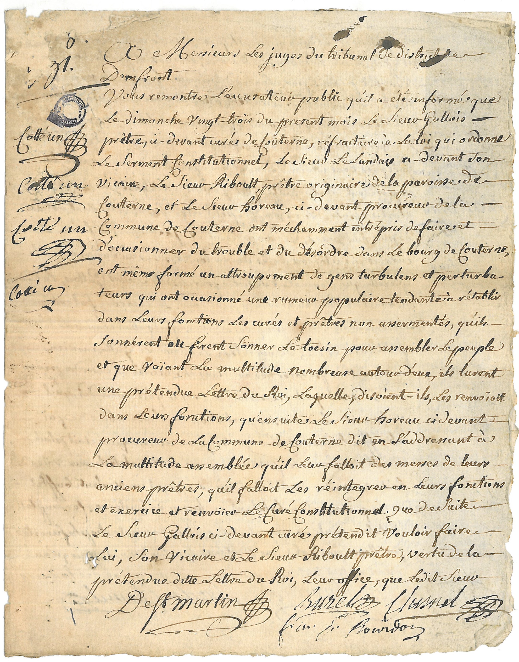 Vous remontre l'accusateur public qu'il a été informé que, le dimanche vingt-trois du présent mois, le sieur Gallois, prêtre, ci-devant curé de Couterne, réfractaire à la loi qui ordonne le serment constitutionnel, le sieur Lelandais, ci-devant son vicaire, le sieur Riboult, prêtre, originaire de la paroisse de Couterne, et le sieur Horeau, ci-devant procureur de la commune de Couterne, ont méchamment entrepris de faire et d'occasionner du trouble et du désordre dans le bourg de Couterne, ont même formé un attroupement de gens turbulens et perturbateurs qui ont occasionné une rumeur populaire tendante à rétablir dans leurs fonctions les curés et prêtres non assermentés, qu'ils sonnèrent et firent sonner le tocsin pour assembler le peuple et que voïant la multitude nombreuse autour d' eux, ils lurent une prétendue lettre du Roi, laquelle, disoient-ils, les renvoioit dans leurs fonctions, qu'ensuite le sieur Horeau, ci-devant procureur de la commune de Couterne, dit en s'adressant à la multitude assemblée qu'il leur falloit des messes de leurs anciens prêtres, qu'il falloit les réintégrer en leurs fonctions et exercice et renvoïer le curé constitutionnel, que de suite le sieur Gallois, ci-devant curé, prétendit vouloir faire lui, son vicaire et le sieur Riboult, prêtre, vertu de la prétendue ditte lettre du roi, leur office, que ledit sieur Le Gallois et les deux ecclésiastiques susdits réclamèrent mesme à cet effet de la nombreuse assistance secours et protection, ce qui leur fut promis par le susdit sieur Horeau, au nom et pour toute l'assemblée. La scène alloit devenir sérieuse et vraisemblablement tragique ; mais heureusement il arriva qu'un officier de garde nationale d'une paroisse éloignée passoit par Couterne. Quelques bons citoiens, amis de la paix et du bon ordre, lui exposèrent le tumulte qu'il y avoit à l'église, le danger ou étoit exposé le sieur Le Petit, curé constitutionnel, installé depuis huit jours, le conjurèrent de secourir et défendre le curé et les citoiens amis de la loi, exposés au danger par la querelle qui leur étoit suscitée par lesdits sieurs Gallois, Lelandais, Riboult et Horeau et leurs partisans. Le désordre fut extrême : on entendoit dire à plusieurs assistans qu'il falloit chasser le sieur Petit, curé, et ses democrates. Le sieur Le Gallois, ancien curé ne cessoit de pérorer les assistans et d‘exciter le désordre parmi eux, disant qu'il persistoit à tout ce qu'il avoit dit, qu'il réclamoit le secours et protection de l'assemblée, ce qui échauffa tellement les esprits, qu'un citoïen qui s'étoit placé au côté du sieur Le Petit, curé, pour mettre obstacle aux voies de fait et insultes dont il étoit menacé, reçut un violent soufflet de la femme d'un habitant du bourg de Couterne. Ce soufflet étoit sans doute le signal et le prélude d'une catastrophe funeste, périlleuse pour le sieur Petit, curé constitutionnel puisqu'au même instant, toutes les femmes ainsi que partie des hommes se disposoient à faire sur lui la plus impétueuse irruption si un citoïen pacificateur, ami du bon ordre, n'eut fait au sieur Le Gallois et à ses adherens des représentations sensées et judicieuses, ne les eut sommés au nom de la loi de rentrer dans le devoir et n'eut à ce moien, en accompagnant le sieur Petit, facilité sa fuite qui le mit enfin à l'abri de tout outrage.