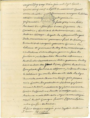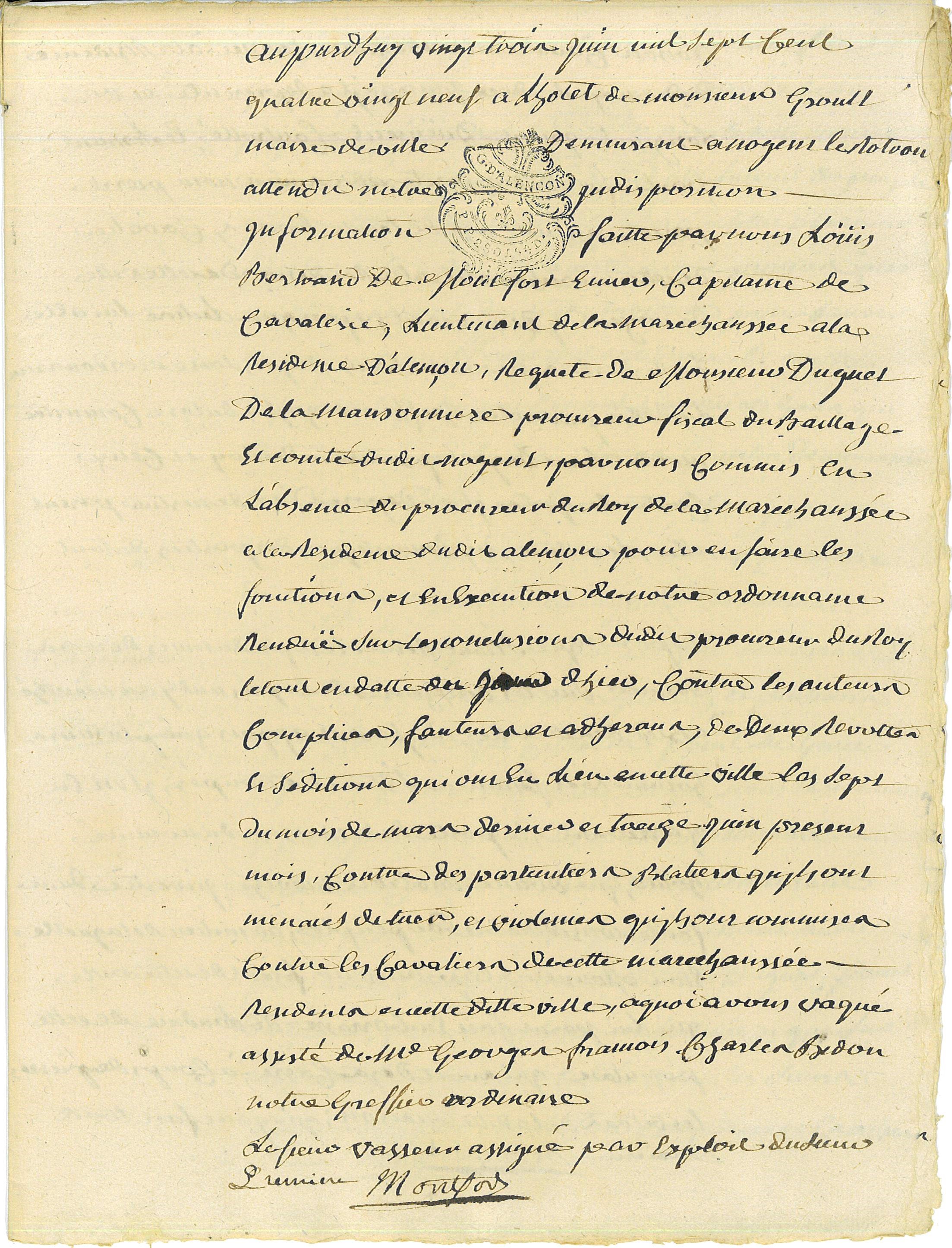 (…) Aujourd'hui, 23 juin 1789, le sieur (…) Pierre Pascal Vasseur, âgé de trente-six ans, cavalier de maréchaussée à la résidence de Nogent, (…) dépose qu’il s’est rendu le 7 du mois de mars dernier, à deux heures de l’après-midi au marché à blé de cette ville, où il avait appris que plusieurs hommes et femmes s’étaient attroupés. Il vit en y arrivant, la porte de la maison du nommé Homo, qui donne sur ledit marché, investie d’une foule considérable du peuple, au milieu de laquelle était Monsieur le procureur fiscal de cette ville qui lui parut fort embarrassé de l’audace de cette populace, qui avait déjà cassé, à coups de pierre les vitres de ladite maison.