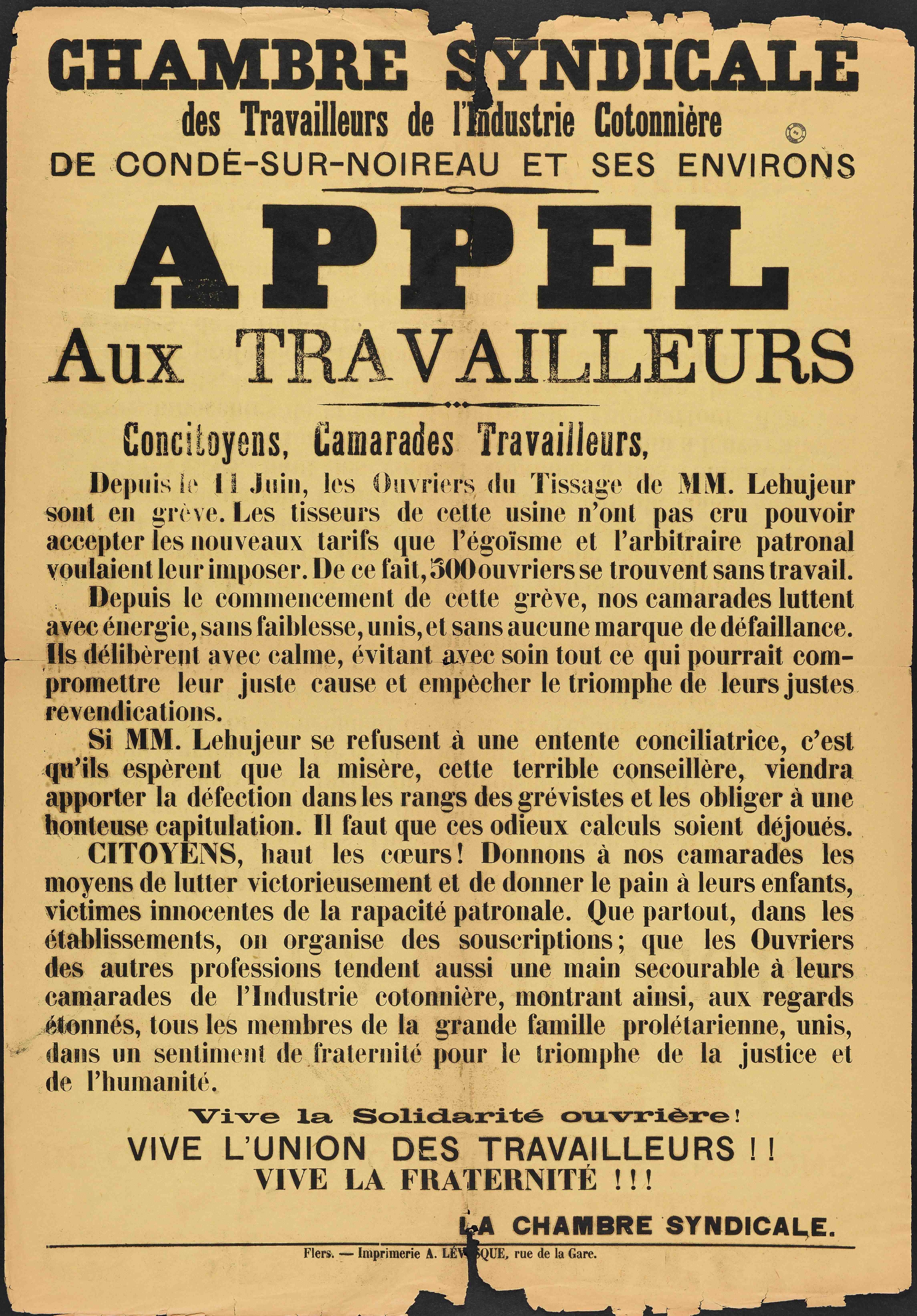 En complément du document précédent, cette affiche réalisée par la Chambre syndicale des travailleurs de l’industrie Cotonnière de Condé-sur-Noireau (aujourd'hui Condé-en-Normandie, Calvados) pendant la longue grève de juin à août 1897 aux ateliers de tissage Lehugeur (ou Lehujeur selon les sources) montre une évolution notable du syndicalisme.