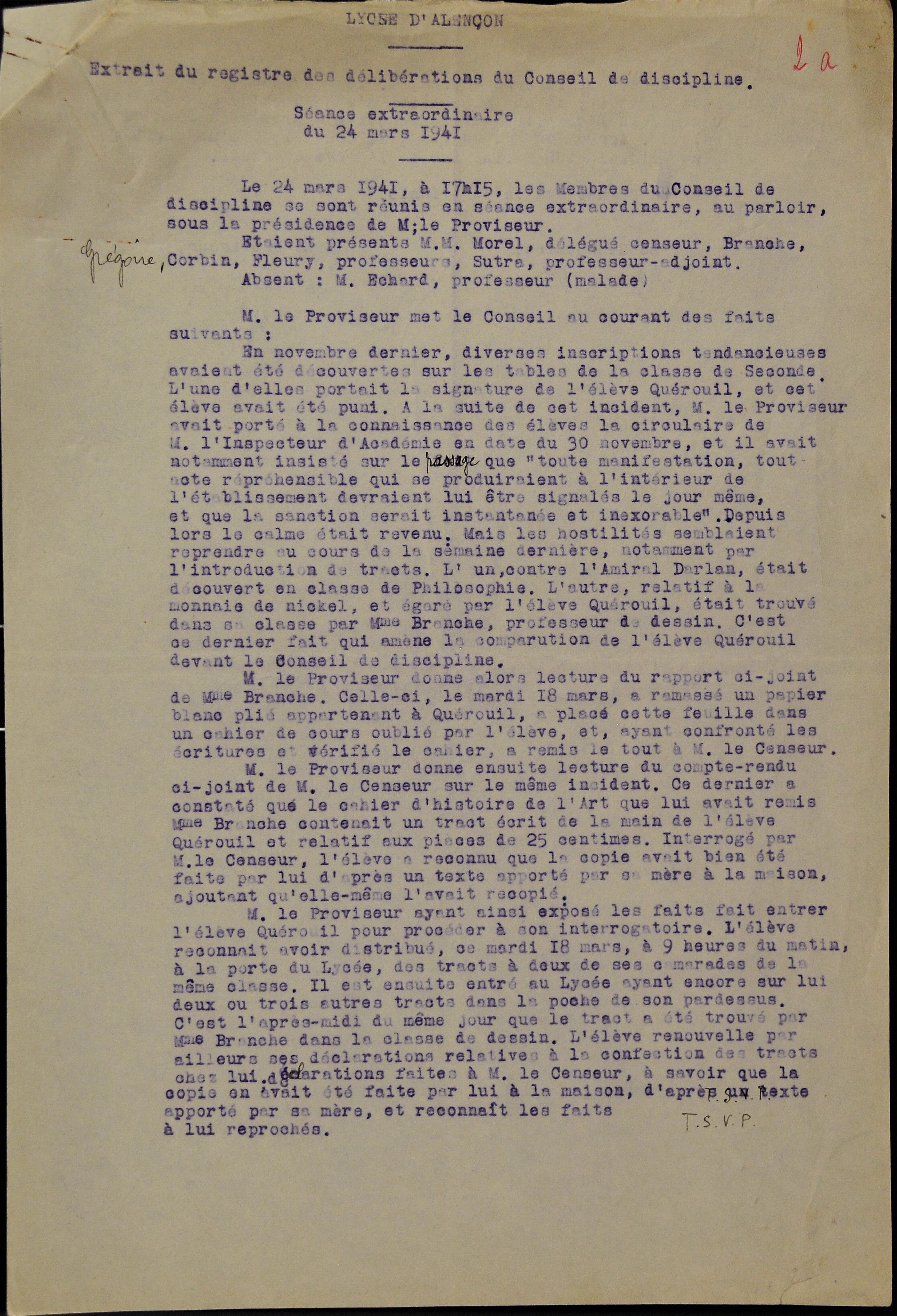 Le 23 mars, Yves Quérouil passe donc en conseil de discipline. Nous en présentons ici le procès-verbal. Il permet d’illustrer l’engagement de nombreux jeunes gens dès l’automne 1940 dans diverses actions qui, si elles ne constituent pas une résistance organisée, n’en révèlent pas moins un refus évident de la situation d’occupation et de collaboration. Pour certains, ce seront là les premiers pas vers une implication plus sérieuse (voir dans ce chapitre les documents relatifs à Raymond Ciroux et Jean Pilou).