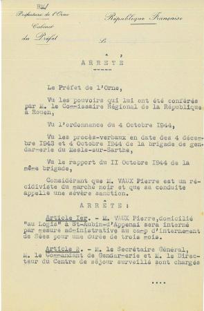 Comme on l’a vu dans la présentation du document précédent, le rationnement des denrées est maintenu jusqu'en 1949. Dès lors, le marché noir se perpétue également, comme pendant les années de guerre. Le document présenté ici est un arrêté préfectoral qui ordonne la détention administrative d’un acteur de ces trafics, qualifié de « récidiviste du marché noir ». Pour le préfet, il s’agit tout autant de dissuader les trafiquants que de calmer l’opinion publique qui se plaint beaucoup des difficultés du ravitaillement (voir les documents suivants).