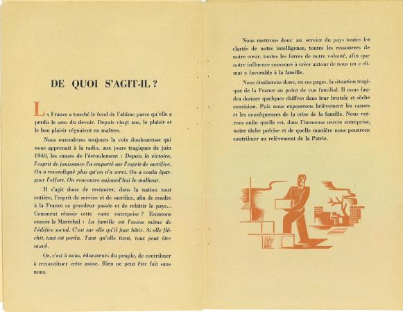 Ce document est la préface d’une brochure de propagande intitulée « L’instituteur et son rôle », publiée en 1941 (ou 1943 ?) par le Commissariat général à la Famille, qui dépend du Secrétariat d’Etat à la famille et à la Santé. Elle est rédigée par Paul Haury, Inspecteur général de l’Instruction publique et directeur de Cabinet du secrétariat d’Etat à la Famille et à la Santé. Elle veut sensibiliser les instituteurs aux préoccupations natalistes de Vichy.
