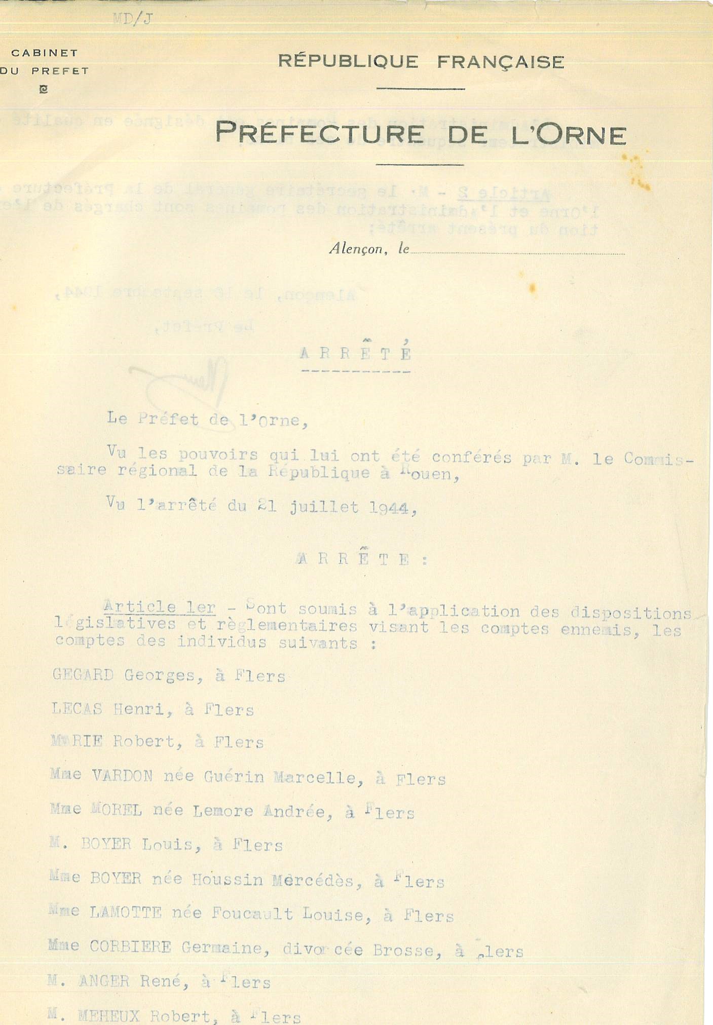 Le 16 septembre 1944, le préfet Robert Lécuyer ordonne par cet arrêté la mise sous séquestre des comptes bancaires d’une série de personnes habitantes de Flers soupçonnées de collaboration. Cette décision administrative ne constitue pas une condamnation ; elle est prise à titre préventif avant que les individus concernés ne soient jugés.