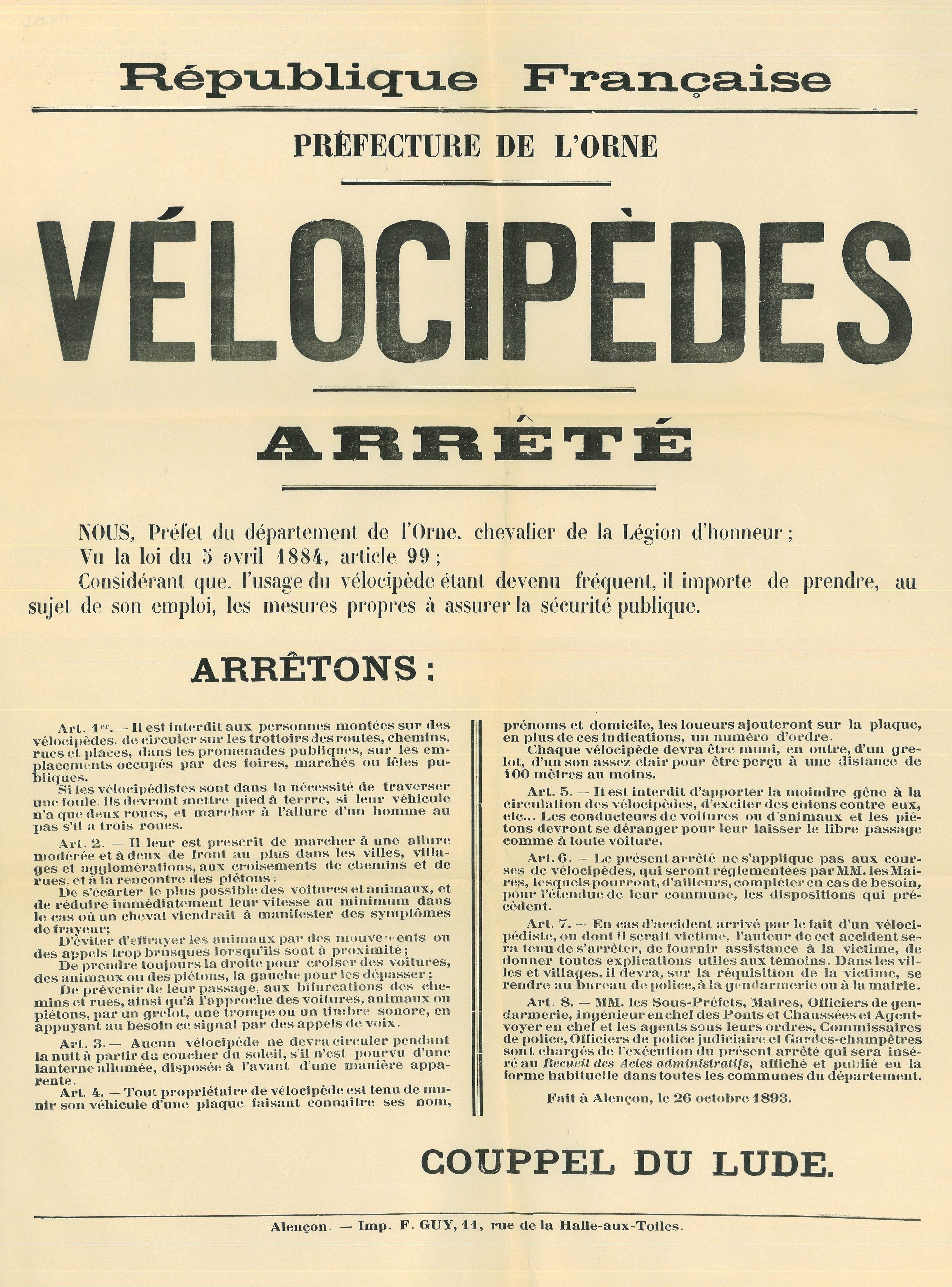 Comme on l’a vu dans le document précédent avec l’exemple d’Alençon, ce sont d’abord les villes qui, face au nombre croissant de cyclistes, ressentent la nécessité de règlementer leur circulation. Sur l’ensemble du territoire, on voit donc apparaître au cours des années 1870 et 1880 de nombreux arrêtés municipaux, pour la plupart très restrictif sur les usages de la bicyclette.