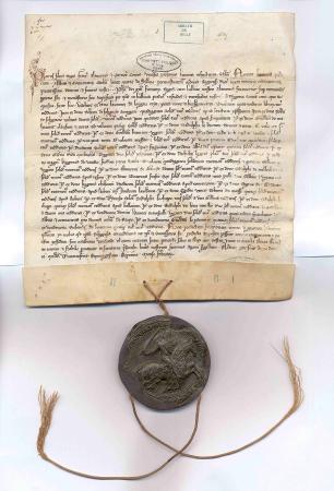 Technique(s) / Support(s) / Dimension(s) : Charte, parchemin scellé d'un sceau équestre de cire verte sur cordelettes, 26 x 24 cm