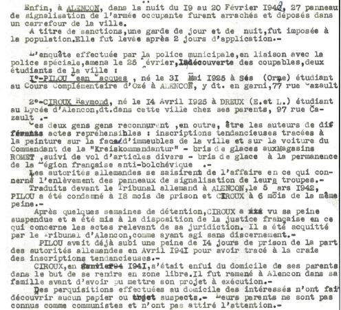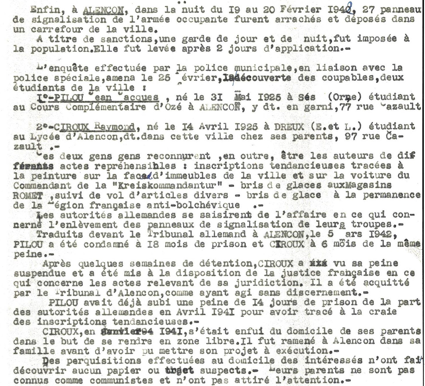 Le passage évoque les actions menées par Raymond Ciroux, 17 ans, élève au lycée d’Alençon et Jean-Jacques Pilou, du même âge, scolarisé en 3e année de cours complémentaire de l’école primaire supérieure d’Ozé à Alençon. Rappelons que les cours complémentaires accueillent les élèves qui ne peuvent aller au lycée, en raison de leur niveau insuffisant ou de leur manque de revenus (le lycée était payant). Dans la nuit du 19 au 20 février, les deux camarades ont arraché « 27 panneaux de signalisation de l’armée occupante » et les ont « déposés dans un carrefour » de la ville. L’objectif était évidemment de perturber les déplacements de l’armée allemande mais aussi de manifester symboliquement le refus de l’occupation.
