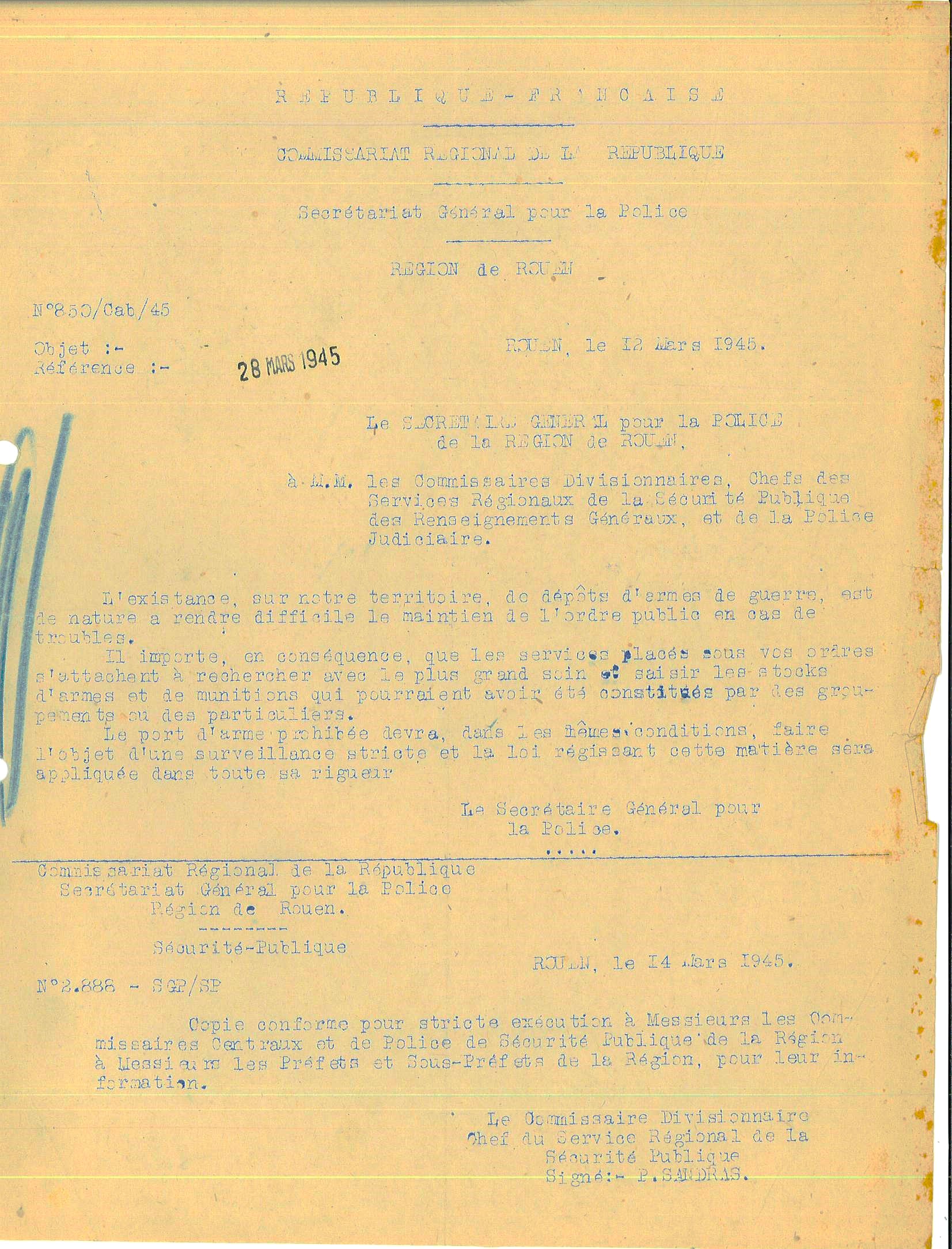 Au lendemain de la guerre, de nombreuses armes circulent sur le territoire. Pour les autorités, il est impératif de mettre fin à cette situation qui menace le monopole étatique de l'exercice de la force. Aussi la police reçoit-elle l’instruction de rechercher et des saisir ces stocks d’armes de guerre.