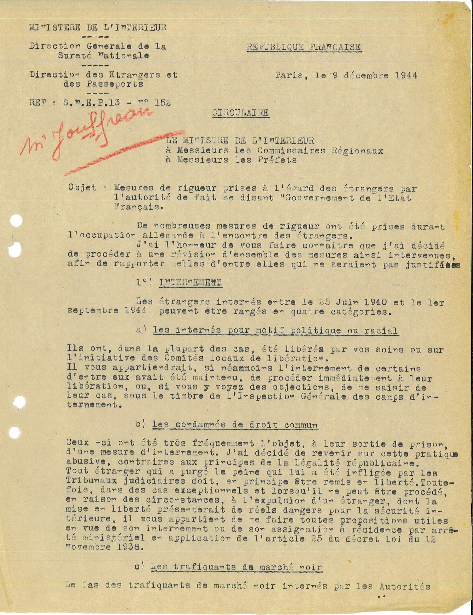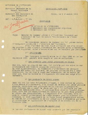Le document présenté est un courrier du ministre de l’intérieur du GPRF, Adrien Tixier, à destination des préfets et des commissaires régionaux de la République. Il s’agit de rétablir les principes républicains à l’égard des étrangers qui ont subi de nombreuses mesures discriminatoires sous Vichy.