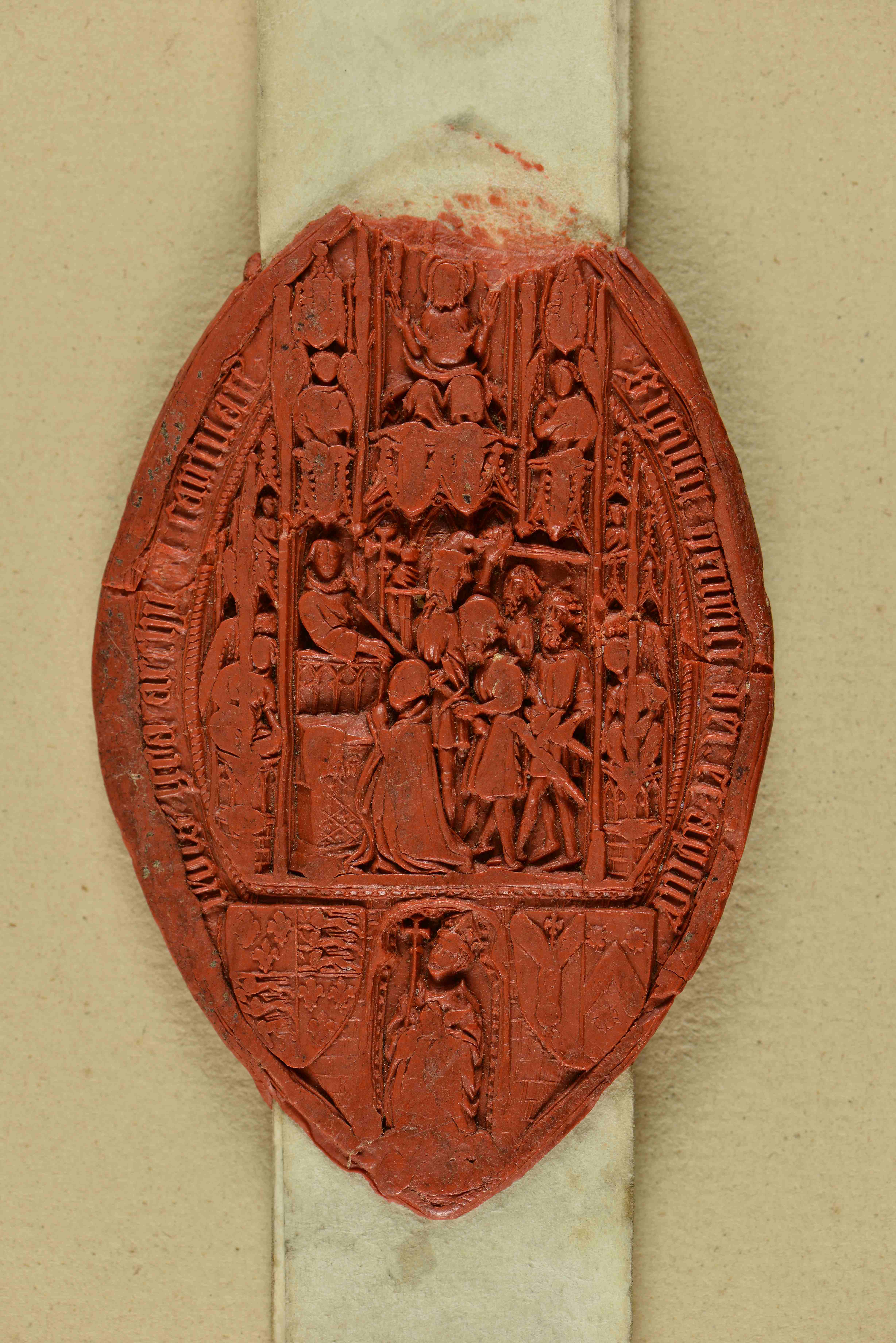 Sceau d’Henri, archevêque de Canterbury, appendu à un vidimus du traité d’alliance signé à Bourges le 18 mai 1412 entre Henri, roi d’Angleterre, Jean, duc de Berry, Charles, duc d’Orléans, Jean, comte d’Alençon contre Jean, duc de Bourgogne