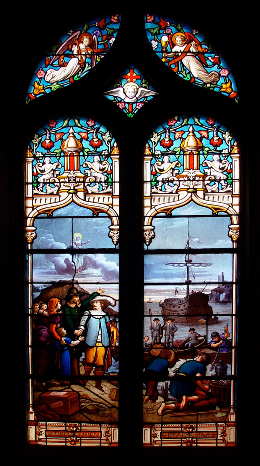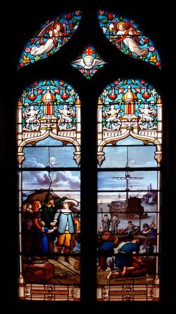 Tourouvre, vitrail de l’église représentant le départ de Julien Mercier en Nouvelle-France