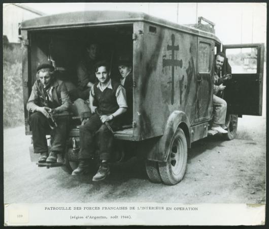 Les FFI de l’Orne ont contribué à la libération du département par de nombreuses opérations de sabotage mais aussi en guidant les troupes alliées au mois d’août. Cette photographie prise à Ecouché en août 44, montre un groupe de FFI dans une camionnette ornée de la croix de Lorraine, emblème de la France Libre depuis 1940. Le jeune homme à gauche porte une mitraillette Sten, une arme remise aux résistants par les parachutages britanniques (voir la notice d’utilisation présentée dans ce chapitre).