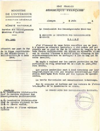 Ce courrier issu des fonds de la Préfecture est écrit par les Renseignements généraux de l’Orne, à destination du directeur des Renseignements Généraux à Vichy.