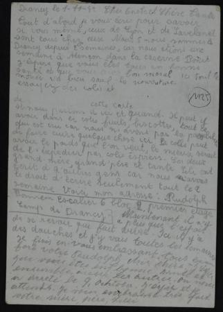 si nous partons d’ici et quand. Il peut y avoir dans le colis fruits, biscottes, tout ce qui est cru car nous n’avons pas la possibilité de faire cuire quelque chose ici. Le colis peut avoir le poids que l’on veut, le mieux serait de l’expédier par colis éspress. Les deux grand-mère, grand-père et tante Lili ont écrit à d’autres gens car nous n’avons le droit d’écrire seulement tout le 2 semaine. Voici mon adresse : Rudolph Bonnem escalier 6 bloc 2 premier étage Camp de Drancy. Maintenant il n’y a plus que l’espoir de se revoir qui fait vivre. Ici il y a des douches et j’y vais toutes les semaines. Je finis en vous embrassant tous bien fort votre Rudolph.