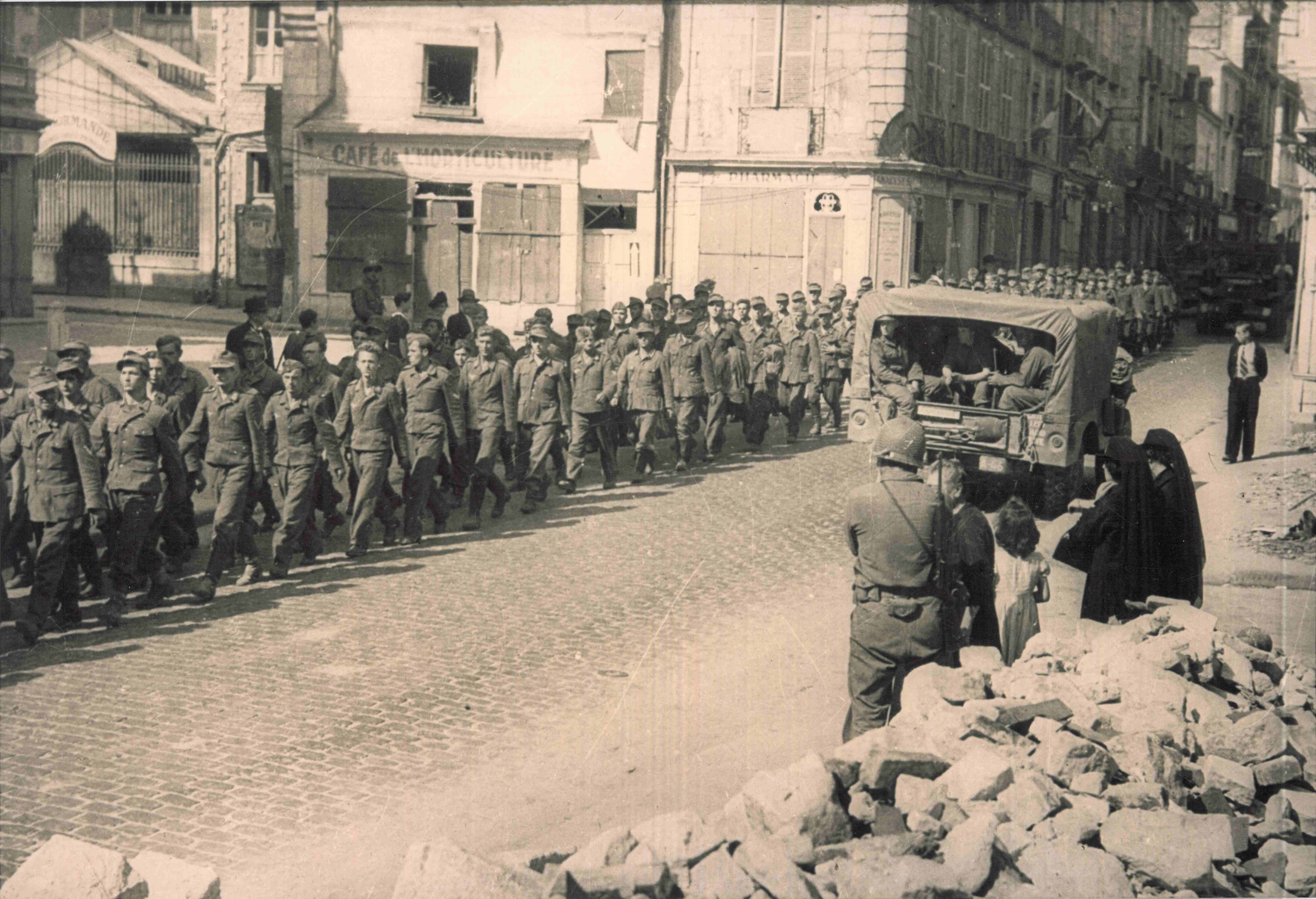 En voici quelques-uns (une centaine) qui traversent Alençon, place du Puits au Verrier, au mois d’août, gardés par des soldats américains de la police militaire (MP, lisible sur le casque du soldat installé devant le Café de l’Horticulture). Quelques passants regardent ce spectacle nouveau et tant attendu. On remarque quelques drapeaux français à un balcon de la Grande Rue à l’arrière-plan. Au premier plan, les amoncellements de gravats, tout juste entassés pour libérer la rue, sont les stigmates des bombardements du 17 juillet.