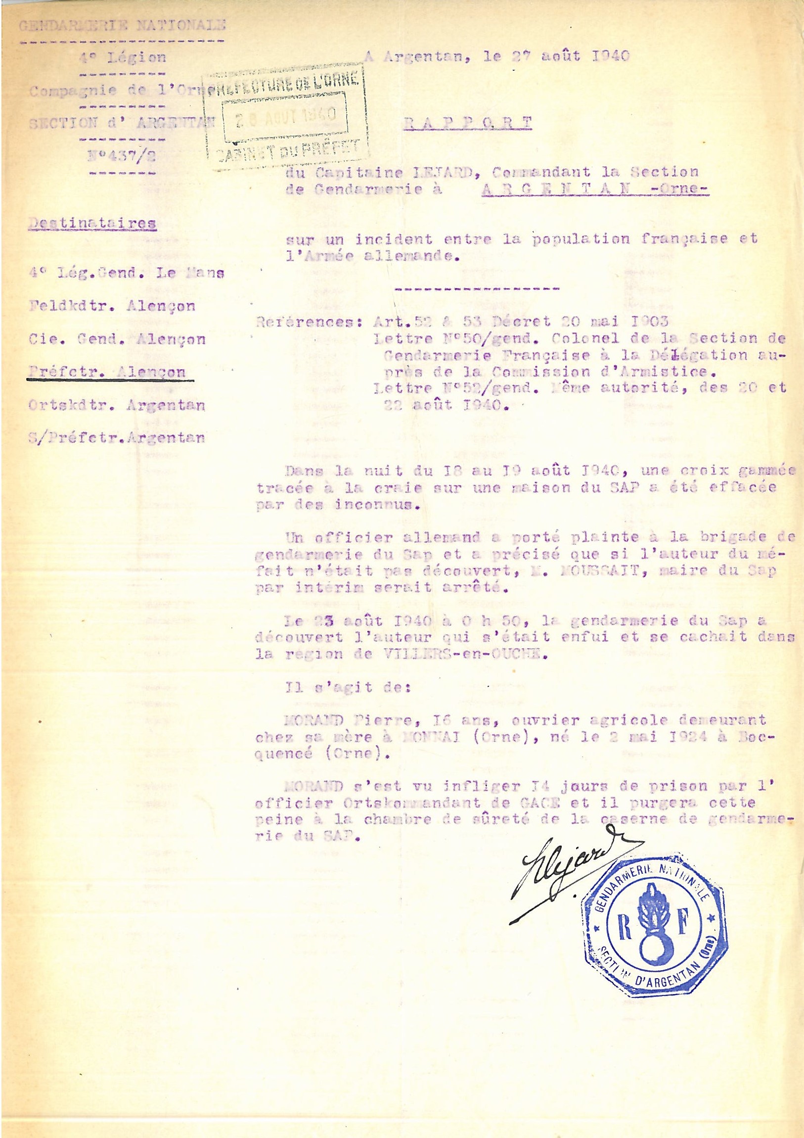 Cet épisode est significatif des toutes premières manifestations d’une forme de résistance. Cela ne fait que quelques semaines (depuis le 17 juin) que l’Orne est occupée et l’acte de Pierre Morand ne s’inscrit pas dans le cadre d’une opération planifiée ou encadrée par une organisation. Comme Martial Coupry et Roger Coupé, deux autres très jeunes hommes (voir dans ce dossier), il réagit d’une manière épidermique à une situation qui lui semble intolérable. Un peu partout sur le territoire, on observe des épisodes comparables qui témoignent d’un refus d’accepter la défaite et l’occupation. Ce refus est un premier pas dans l’entrée en résistance.