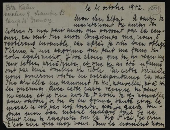 Le document présenté ici est la dernière carte postale écrite le 21 octobre 1942 par Lilli Meyer à son mari Albert, interné à la prison de Villeneuve-Saint-Georges, depuis le camp de Drancy. Elle provient des archives du mémorial de Yad Vashem.