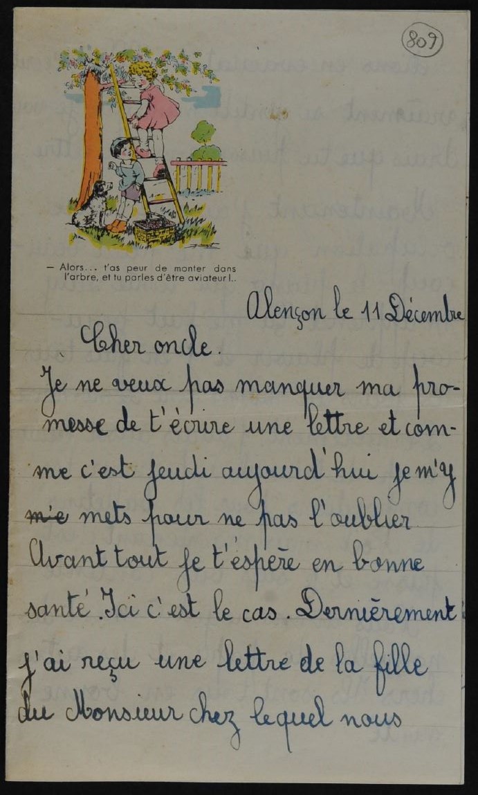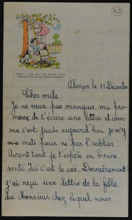 Nous sommes en décembre 1941. Edith est alors scolarisée à l’école supérieure de jeunes filles de Montsort où elle poursuit son chemin de bonne élève. Elle écrit à son oncle Albert Meyer, qui est emprisonné à Caen depuis le mois de janvier. Il avait eu le malheur de dire publiquement tout le mal qu’il pensait de Hitler ; il a été dénoncé puis condamné à 5 ans de prison pour « propagande anti-allemande ». Son épouse, Lilli (née Kahn), vit rue des Granges avec Edith. Elle écrit à Albert deux à trois fois par semaine (voir le chapitre "Rafles, déportation et extermination"). Assez souvent, Edith, Gustel, Rudolph ou Ida ajoutent un petit mot au bas de ses cartes. Ici, c’est l’inverse : c’est Edith qui écrit, et Lilli qui ajoute quelques phrases à la fin.