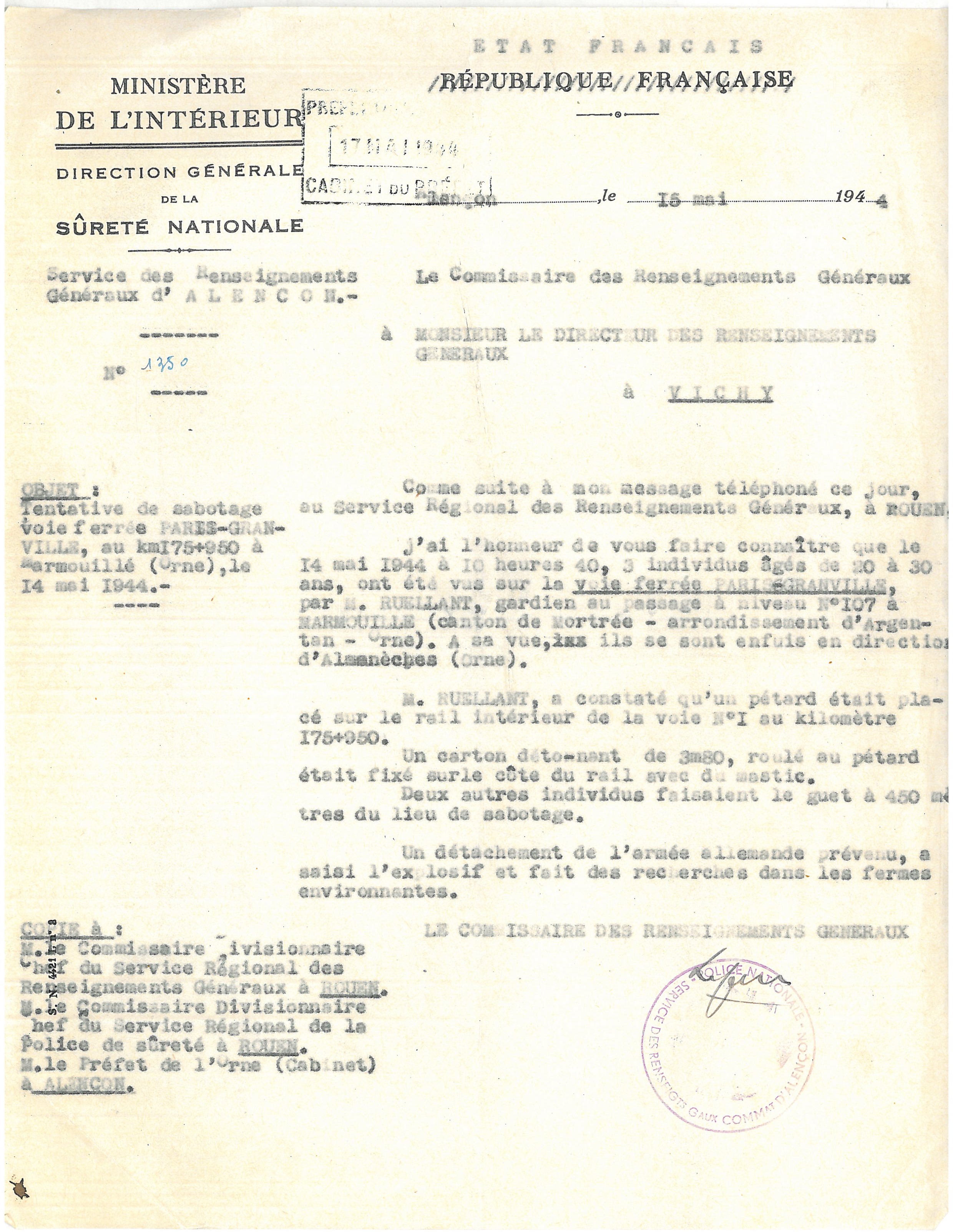 Le document présenté ici est un courrier issu des renseignements généraux de l’Orne, en date du 15 mai, à destination du directeur des Renseignements Généraux à Vichy. Il témoigne parmi d’autres de la forte activité de sabotage dans l’Orne au printemps 1944.