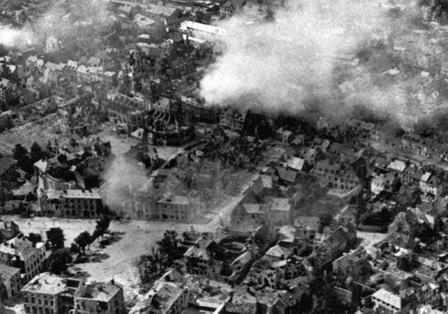Cette photographie prise au lendemain de la libération, le 21 août, montre combien la ville a souffert des bombardements et des combats. Les incendies causés par les bombardements d’artillerie fument encore et l’on peut voir que de nombreux bâtiments sont fortement endommagés, notamment au premier plan et sur la place du Marché.