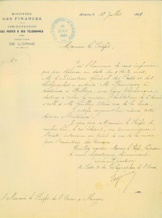 J’ai l’honneur de vous informer que par décision en date du 9 de ce mois, M. le directeur Général des Postes et des Télégraphes a autorisé M. Bournisien à construire à Bellême une ligne téléphonique destinée à relier la maison d’habitation de ce dernier à celle de M. Guillin située rue de la Herse.