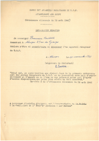Le 10 novembre 1941, Berthold Bonnem, 16 ans, se rend à la mairie pour signer le document présenté ici, et qui certifie qu’il ne possède pas de poste radio. Quelques jours auparavant, sa mère, Gustel, était venue faire la même déclaration.