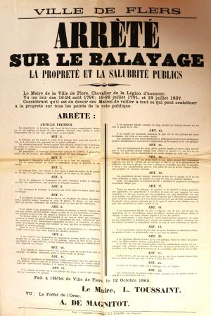 L’arrêté municipal pris à Flers en octobre 1865 s’inscrit dans un vaste mouvement qui, à l’échelle de toute l’Europe, vise à assainir l’espace urbain tandis que les villes se développent à grande vitesse. Flers connaît alors une croissance soutenue, portée par le développement de l’industrie textile : la population passe de 2 797 habitants en 1806 à presque 14 000 en 1886. Le document nous renseigne sur les pratiques que le maire Louis Toussaint (en fonction de 1854 à 1880) juge désormais nécessaire d’interdire (ou d'en rappeler l’interdiction) pour lutter contre l’insalubrité. A travers l’espace urbain, c’est aussi la société et les corps que l’on cherche à règlementer, plus particulièrement sans doute les corps des ouvriers.