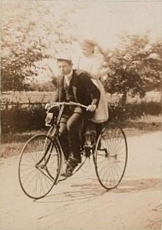 Le modèle utilisé ici par ces jeunes gens en promenade est plutôt élaboré, et donc sans doute coûteux. La transmission se fait par chaîne sur les routes motrices arrière ce qui, par la différence de diamètre entre le plateau et le pignon, produit un rendement plus efficace de l’effort du cycliste. On note aussi que cette machine est équipée d’une lanterne et d’un garde-boue à l’avant.