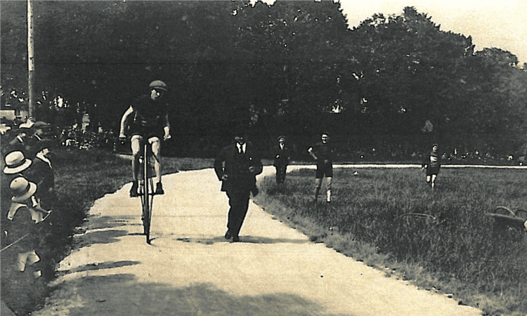 Cette photographie issue de la collection privée d’A. Jidouard a été prise à la fin du XIXe siècle à l’occasion d’une course de grands bis dans le vélodrome d’Argentan. Elle permet de rappeler que la forme moderne du vélo ne s’est pas imposée d’emblée.