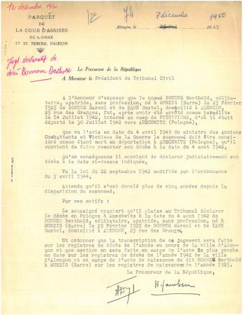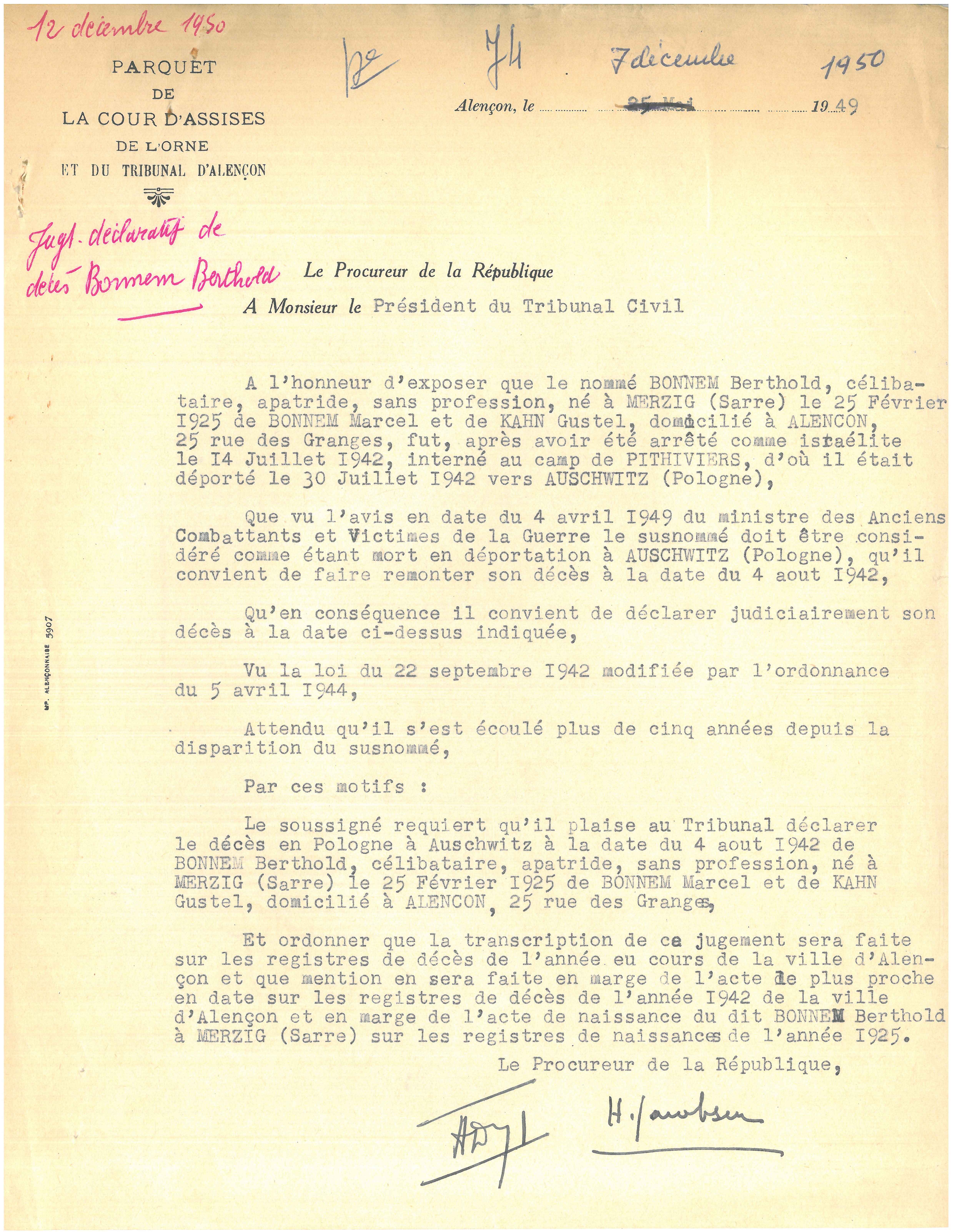 De retour à Alençon, Alfred Kahn doit accomplir de pénibles démarches administratives pour obtenir la reconnaissance juridique du décès des nombreux membres de sa famille assassinés par les nazis. Il sollicite ainsi le Tribunal de 1ere instance pour ses parents, Julius et Ida, ses sœurs, Gustel et Lilli, son frère Edgard, ses beaux-frères, Marcel et Albert, ses neveux, Berthold, Rudolph et Edith. Tous ces documents sont conservés aux Archives de l’Orne et l’on peut imaginer le difficile parcours d’Alfred auprès des services de l’administration. Pour chacun de ses proches disparus, un formulaire et des rendez-vous au tribunal qui furent autant d’occasion de raviver des souvenirs très douloureux.