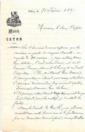 Le document proposé ici permet d’illustrer plusieurs aspects des mouvements sociaux dans l’industrie textile à la fin du XIXe siècle. Il s’agit du courrier envoyé au sous-préfet de Mortagne par le premier adjoint du maire de Ceton afin de l’informer du déclenchement, le 21 février 1887, d’une grève dans la ganterie Neyret. La version intégrale du document est disponible au format pdf par le lien ci-dessus.