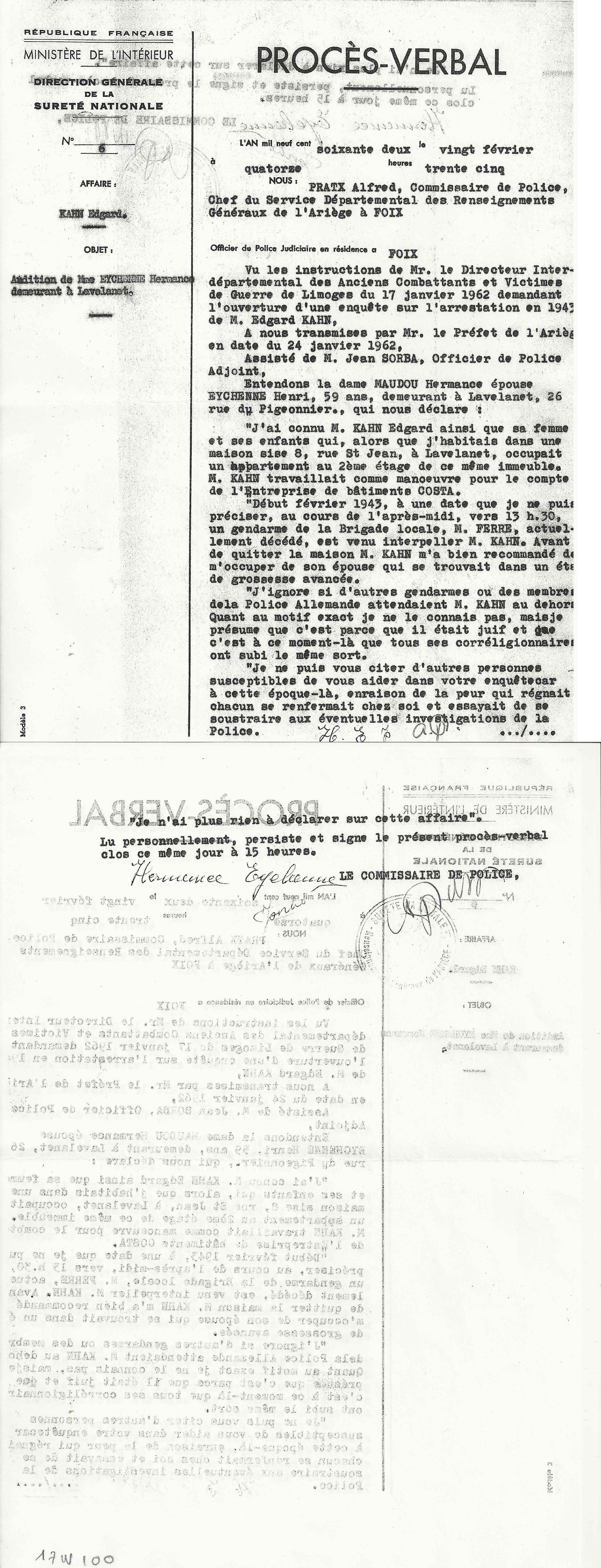 Le document est le procès-verbal de l’audition d’Hermance Eychenne réalisée en février 1962 dans le cadre d’une enquête menée à la demande du préfet de l’Ariège concernant les « résistants politiques ». Il est conservé par les Archives départementales de l’Ariège. Hermance Eychenne rapporte qu’Edgard a été arrêté par un gendarme français alors que sa femme était enceinte de leur deuxième enfant, Evelyne, qui naîtra quelques jours après, le 26 février. Alfred Kahn, le grand-frère d'Edgard, racontera plus tard que Liesel avait supplié le gendarme de faire comme s’il n’avait pas trouvé Edgard ; mais celui-ci avait répondu qu’il craignait de perdre son poste.