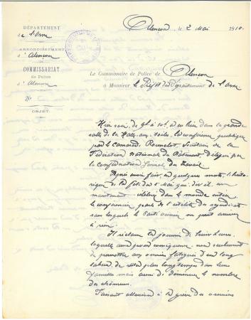 Le commissaire de police de Alençon à Monsieur le Préfet du département de l’Orne,