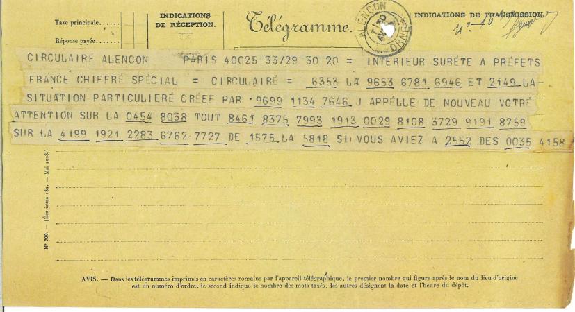 Le document présenté est un télégramme codé adressé par le Ministère de l’Intérieur à tous les préfets de France à la veille du 1er mai 1910. Il illustre l’attention particulière que les autorités portaient à cette journée. Le texte décodé se trouve dans la transcription ci-dessous et au format pdf par le lien ci-dessus.