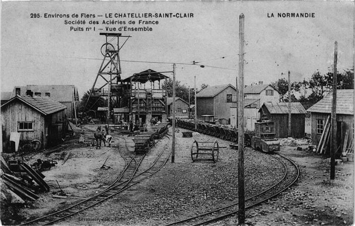 Rappelons que la mine de Saint-Clair-de Halouze, concédée en 1884 à la Société de Saint-Rémy ne commence à être exploitée vraiment qu’à partir de 1905, lorsque les Aciéries de France reprennent la concession et engagent d’importants travaux pour rendre le site opérationnel. Ainsi, c’est en 1905 qu’est « foncé » (c'est-à-dire creusé) le puits n°1 photographié ici ; exploité jusqu'à la Seconde Guerre mondiale, il descendra jusqu'à 180 m pour desservir 5 étages d’exploitation.