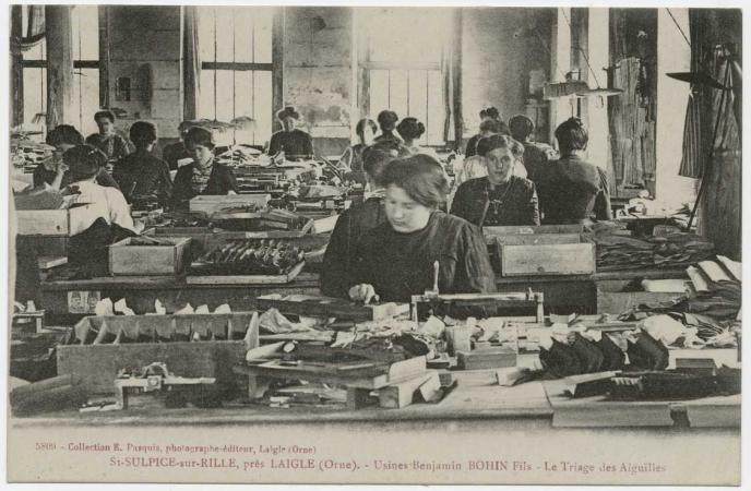 Extrait de la série de photographies prises par Eugène Pasquis dans les établissements Bohin au début du XXe siècle, ce document nous montre les employées occupées au triage et à l'empaquetage des épingles. Cette tâche, qui nécessite des doigts habiles, était réservée aux femmes. L'atelier est abondamment éclairé, à la fois par l'éclairage naturel prodigué par les vastes et nombreuses ouvertures et par l'électricité.