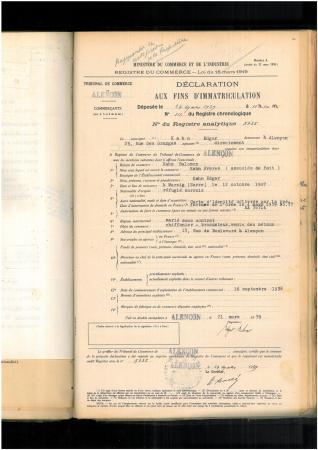 En 1935, les Bonnem partent en Palestine (voir le chapitre "L'échec de l'installation en Palestine"). En mars 1937 cependant, ils renoncent à s'y installer et entrent en France, via Marseille. Ils rejoignent alors Alençon et s'installent rue des Granges, dans la maison de Julius et Ida, les parents de Gustel. En mars 1939, d'après la déclaration présentée ici (déclaration pour immatriculation au registre du Tribunal de Commerce), Marcel, le père de famille, se lance dans une activité de représentant de commerce pour des "articles de Paris et articles de coiffeurs". Ce sont des objets de mode et de décoration (boîtes à bonbons, éventails, poupée, parapluies, ombrelles, brosses, rasoirs, etc.). On sait par les mémoires de Herta Kahn que la famille Bonnem possédait une épicerie à Merzig. Marcel reste ainsi fidèle à la tradition familiale. Par contre, il ne semble pas que son commerce ait prospéré à Alençon puisqu'il ne figure pas en 1940 sur la liste des entreprises susceptibles d'être spoliées par les mesures d'aryanisation.