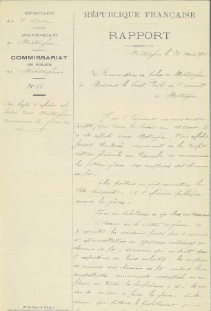 Au cours du XIXe, le réseau de chemin fer maille peu à peu l’ensemble du territoire (voir dans ce dossier le chapitre « révolution des transports ») et son bon fonctionnement devient un enjeu majeur. L’éventualité d’une grève inquiète donc particulièrement les pouvoirs publics comme en atteste ce document. Il s’agit d’un rapport du commissaire de police de Mortagne à l’attention du préfet au sujet d’affiches publiées dans la ville par le Syndicat National des Travailleurs des Chemins de Fer, affilié à la Confédération Générale du Travail (CGT) en août 1910. Ces affiches exposent à la population les motifs qui ont poussé le syndicat, lors de son Congrès en avril 1910, à décider le principe d’une grève. Ce sera en octobre la « grève de la thune », la première grande grève nationale dans les chemins de fer. Ce document permet de mettre en évidence le rôle nouveau et déterminant joué par un nouvel acteur des conflits sociaux : l’opinion publique. Le rapport du commissaire de Mortagne est accessible au format pdf par le lien ci-dessus ; la transcription se trouve ci-dessous.