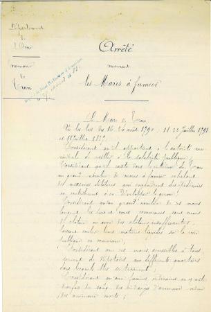 Une situation d’abord : celle de l’hygiène publique dans cette petite ville à la fin du XIXe siècle. A cet égard, les considérants de l’arrêté dressent un tableau peu satisfaisant. Les nombreuses mares à fumier présentes dans le bourg constituent une menace pour la santé publique. Le fumier ne devrait être en principe constitué que des déjections animales ; or, le maire déplore que ces mares servent en fait de « dépotoir » où les habitants se débarrassent de tous leurs déchets, y compris des charognes.