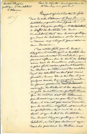 Il s’agit du compte-rendu de la réunion le 23 juillet 1849 du Conseil d’hygiène publique et de salubrité d’Alençon ; lors de cette séance est présenté le rapport commandé quelques semaines auparavant par le préfet sur les facteurs d’insalubrité dans la ville. Le Conseil d’hygiène publique est alors une institution toute récente, mise en place en décembre 1848 par un décret présidentiel dans tous les départements français, sur le modèle du Conseil d’hygiène créé en 1802 dans le département de la Seine. Quelques mois après la création du Conseil national consultatif d’hygiène publique pour conseiller le gouvernement, ce décret constituait un nouveau succès pour les hygiénistes qui, depuis la fin du XVIIIe, s’efforcent de peser sur les politiques publiques.