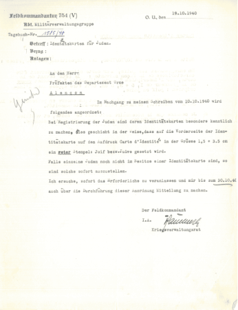 Le 19 octobre 1940, le préfet d’Alençon, Paul Amade, reçoit de la Kommandantur allemande le courrier présenté ici (et traduit ci-dessous). On lui demande de faire apposer sur les cartes d’identité des juifs du département la mention « juif » ou « juive » par un cachet de couleur rouge. Cette mesure s’inscrit dans le cadre de l’ordonnance du 27 septembre 1940, celle qui imposait déjà le recensement obligatoire et l’installation d’une affiche « magasin juif » (voir le document dans ce dossier). Elle participe à la mise en place du processus génocidaire qui commence par l’identification et le marquage des victimes afin de les distinguer du reste de la population. Quelques jours plus tard, le préfet s’exécute et demande au commissaire de police d’Alençon de prévenir toutes les personnes concernées afin qu’elles apportent leur carte d’identité à la préfecture pour recevoir le tampon. Le 11 novembre, le commissaire répond qu’il a accompli cette tâche.