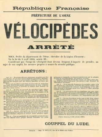 « Considérant que l’usage du vélocipède [était] devenu fréquent », ce texte s’efforce donc d’organiser la cohabitation entre les différents utilisateurs des voies publiques pour éviter les conflits d’usage et garantir la sécurité de tous. Il reprend l’essentiel des règlementations qui avaient déjà été mises en place à l’échelle municipale. Il interdit la circulation cycliste dans les zones piétonnes très fréquentées et « prescrit de marcher à une allure modérée » en présence de piétons ou en approche des carrefours pour éviter les accidents. Comme, à l’époque, on reprochait souvent aux cyclistes d’effrayer les animaux, et particulièrement les chevaux, le texte insiste sur la nécessité pour les cyclistes d’éviter les mouvements brusques, de garder leur distance et de manifester leur présence par un signal sonore.
