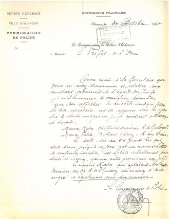 C’est bien ce qu’il se passe comme le montre le document présenté ici. Il s’agit d’un courrier du commissaire de police d’Alençon adressé au préfet de l’Orne, Paul Amade (remplacé par Georges Besnard quelques jours plus tard). Sur un papier qui porte encore l'en-tête "République française", le commissaire rend compte de l’exécution des mesures concernant les affiches « magasins juifs ». Ainsi, l’entreprise de brocante d’Alfred et Egard Kahn, installée rue du Boulevard, dans le quartier de Monsort à Alençon, est marquée au cours du mois d’octobre 1940, tout comme la mercerie « Au rouet d’Alsace » au centre-ville. Dans tout le département, ces mesures sont appliquées. Quelques semaines plus tard, le nouveau préfet, Georges Bernard, en poste depuis le mois de novembre, demande au maire d’Alençon, Charles Chesneaux, de vérifier que cette obligation est toujours bien remplie. Les autorités souhaitent que les affiches ne soient pas accompagnées d’autres mentions telles que « entreprises françaises » par exemple.