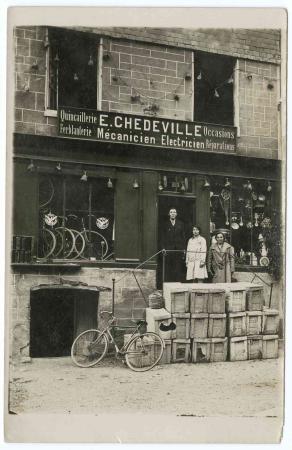 A la diversité de la production répond aussi une diversité de l’offre, illustrée par cette photographie prise à La Ferrière-aux-Etangs au début du XXe siècle. L’artisan-commerçant E. Chedeville, que l’on voit ici sur le pas de sa porte, s’affiche d’abord comme mécanicien-électricien ; son enseigne annonce également des articles de ferblanterie et de quincaillerie, visibles sur la partie droite de la vitrine. Mais il vend aussi des bicyclettes et des pneumatiques de la marque Hutchinson dont l’emblème est affiché sur la partie gauche de la vitrine.