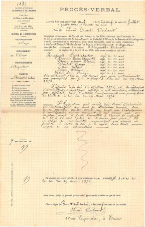 Ce document permet d’illustrer les difficultés d’application de la loi de 1874 présentée dans l’introduction de ce chapitre. Il s’agit d’un procès-verbal réalisé le 19 juillet 1889 dans la verrerie de Saint-Evroult-Notre-Dame-du-Bois par Louis Ernest Valant, inspecteur divisionnaire du Travail des Enfants et des filles mineures dans l’industrie. Ce corps d’inspection est créé par la loi de 1874 pour veiller à sa bonne application. Chaque inspecteur est affecté à une des 15 circonscriptions créées en 1875, qui seront étendues à 25 en 1885 pour leur faciliter le travail. Malgré cette modification, le périmètre de chaque inspecteur reste très étendu : il couvre ici les départements du Calvados, de l’Orne, de la Manche et de la Mayenne.